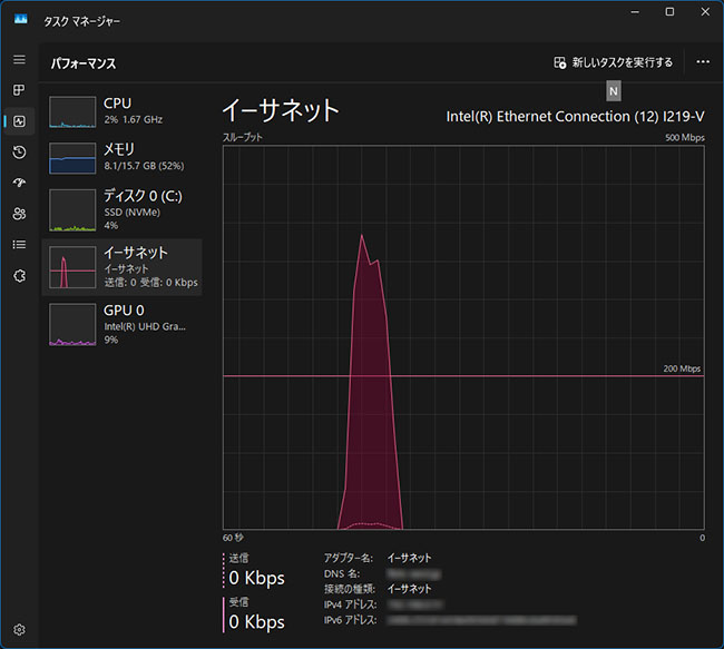 ストリーミングデータ受信 以前の記事でスイッチングハブやLANケーブルの交換を報告してきましたが、ストリーミング中の実際の伝送状況がどの程度帯域を消費しているのか、気になったのでちょっと調べてみることにしました。伝送状況を簡単に確認するだけならWindowsのタスクマネージャからイーサネットの通信状況を見ることができます。Windowsのバックグラウンドサービスを最小限にして、Qobuzアプリでハイレゾソースを再生します。そしてその状況をタスクマネージャのイーサネット伝送状況を確認しました。